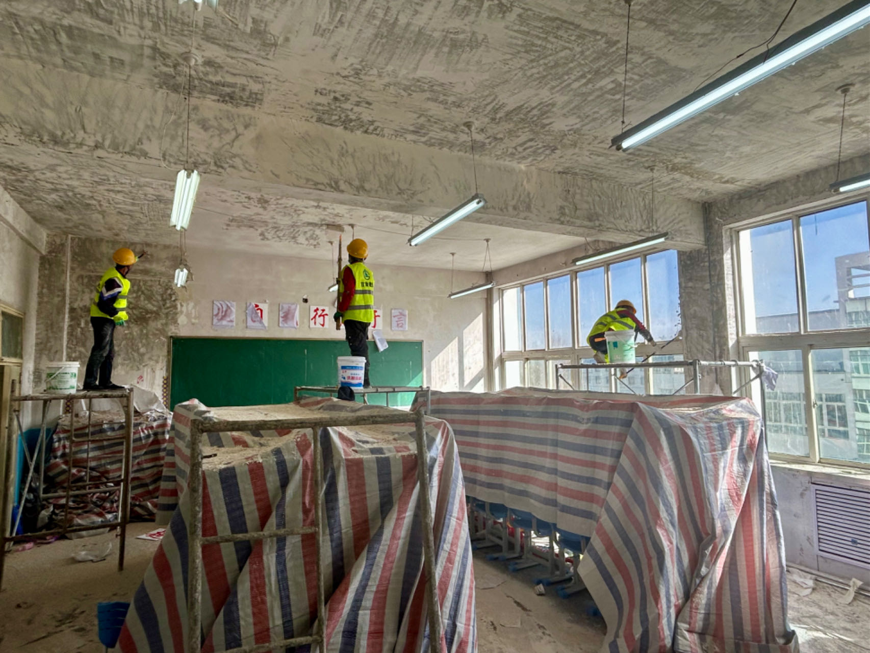在各樓層維修現場,安全標識標牌張貼醒目、成品臨時保護到位,60余名工人分工明確、責任到崗,鏟墻皮、刮膩子、清廢料、做防護,一派繁忙景象。“接到任務后,我們對6層教學樓內部墻面裂縫等問題進行了全面排查,統籌制定施工計劃方案,第一時間召開工作會議,對維修工作進行了安排部署!”現場負責人員緱世君告訴筆者,進入現場后,全體作業人員立刻投入作業,主動聯系施工隊伍、裝修材料、后勤保障物資進場,各小組明確施工任務和工作要求,按計劃組織施工,做好施工任務日計劃、日盤點,抓好任務落實。目前,已同步開展近二十間教室和二、三層教學樓墻面維修,外立面保溫層維修將按計劃陸續推進。