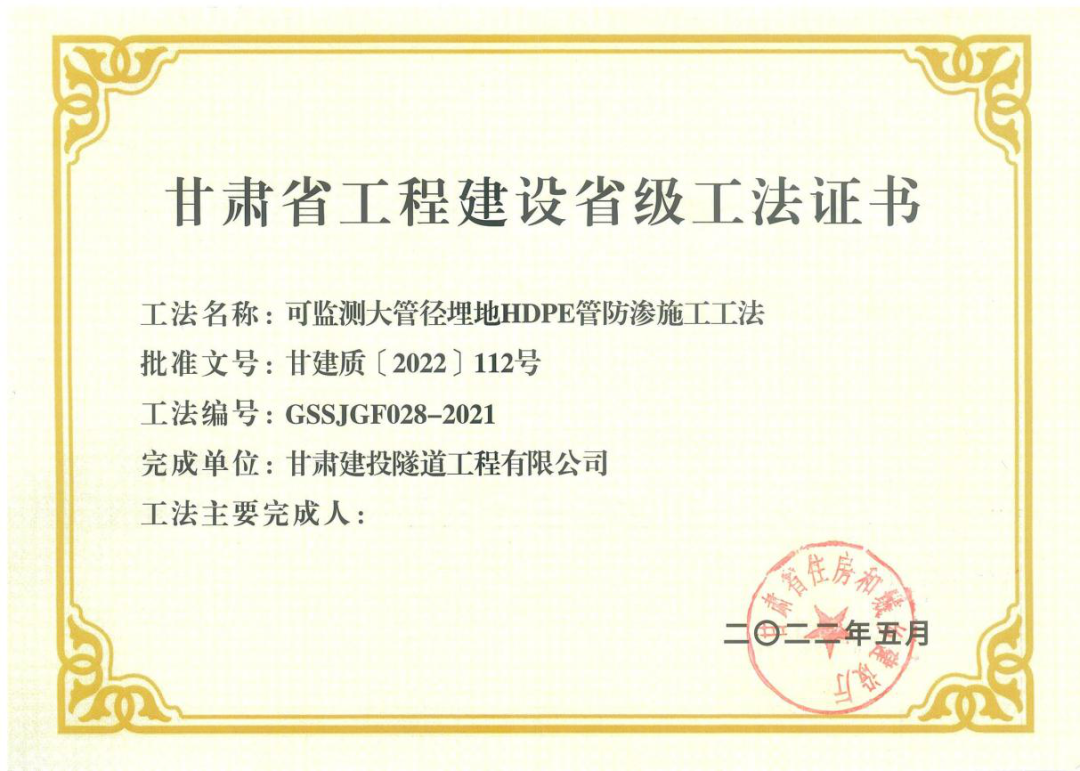 另外,二公司申報(bào)的省級工法《可監(jiān)測大管徑埋地HDPE管防滲施工工法》被評為2022年度省級優(yōu)秀工法。該工法是針對管徑大、管道埋設(shè)較深、排水量大、鋪設(shè)點(diǎn)地質(zhì)復(fù)雜(特別是西北區(qū)域濕陷性黃土地區(qū))、管道接口施工質(zhì)量難以保證、管道破損危害大且維修檢測困難等問題提出來的,經(jīng)一年多來的實(shí)踐證明,本工法技術(shù)先進(jìn)、安全適用,效益顯著,值得向全社會推廣應(yīng)用,有良好的應(yīng)用前景。