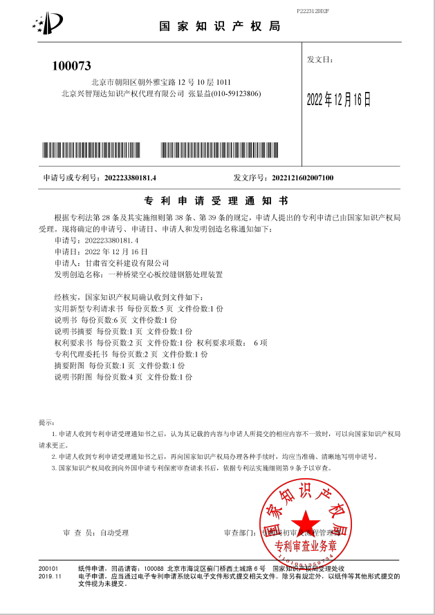 近日,交科公司二公司申報(bào)的《一種橋梁橫隔板安裝吊籃機(jī)構(gòu)》榮獲國家知識產(chǎn)權(quán)局實(shí)用新型專利授權(quán),《一種橋梁空心板絞縫鋼筋處理裝置》成功被國家知識產(chǎn)權(quán)局受理。