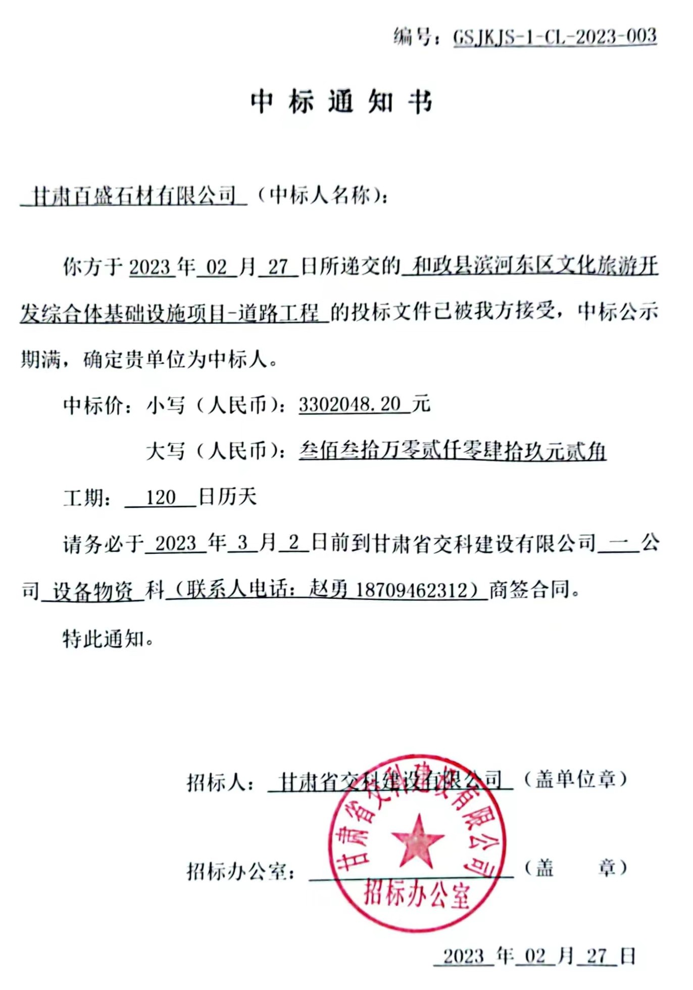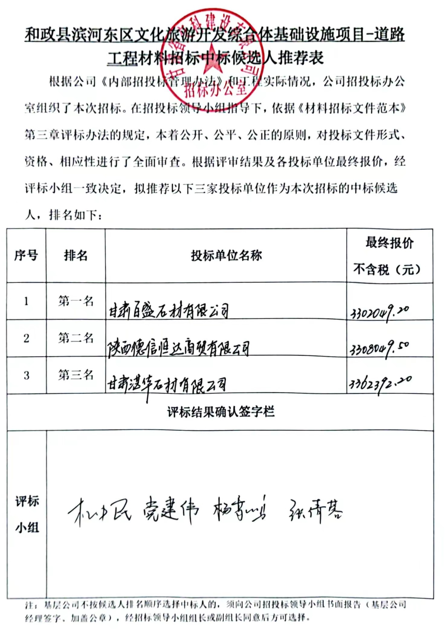 和政縣濱河?xùn)|區(qū)文化旅游開發(fā)綜合體基礎(chǔ)設(shè)施項(xiàng)目-道路工程中標(biāo)候選人及中標(biāo)通知書