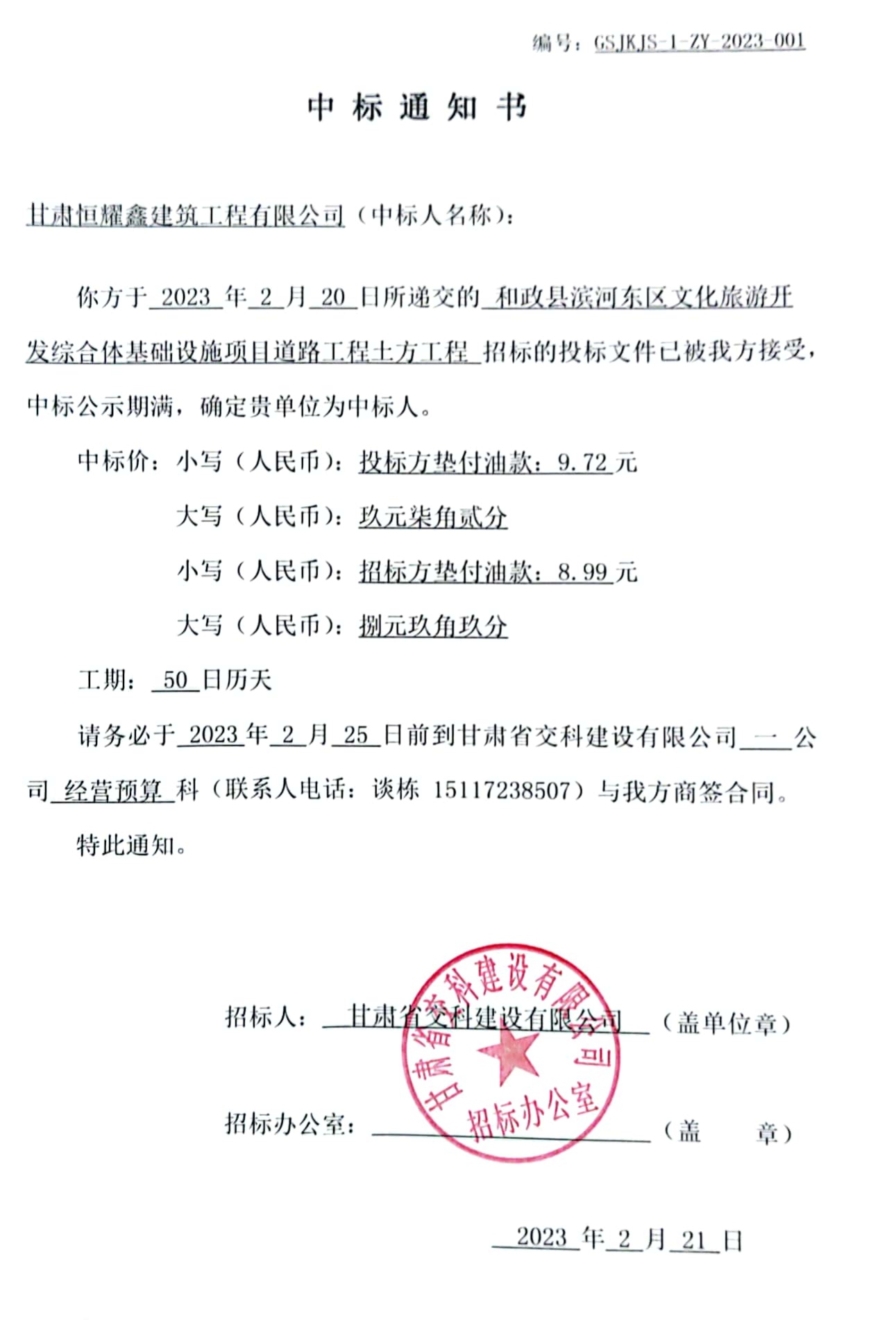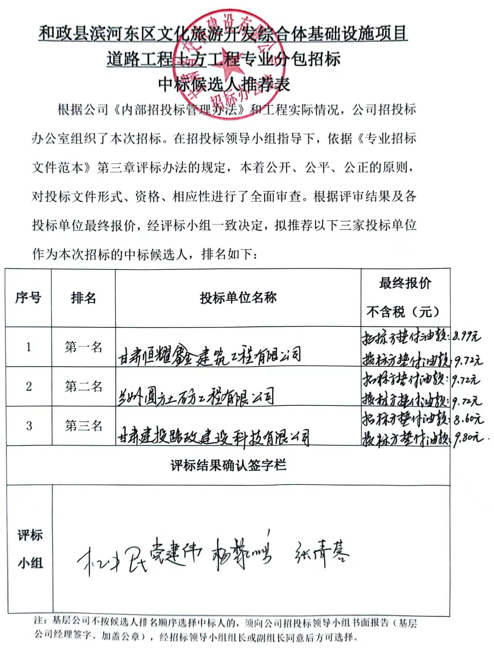 和政縣濱河東區文化旅游開發綜合體基礎設施項目道路工程土方工程中標候選人及中標通知書