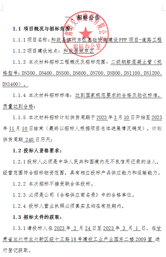 和政縣濱河東區基礎設施建設PPP項目-道路工程材料招標公告