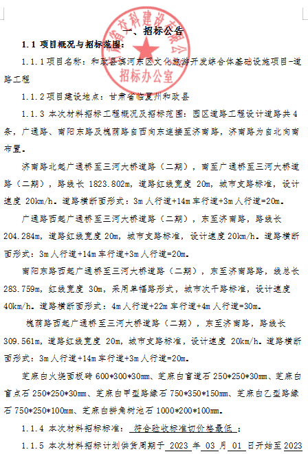 和政縣濱河東區文化旅游開發綜合體基礎設施項目-道路工程材料招標公告