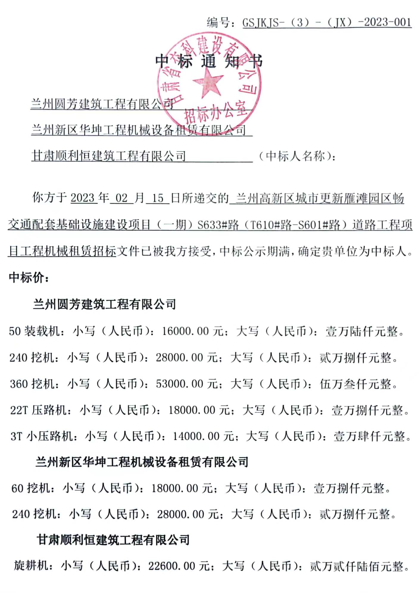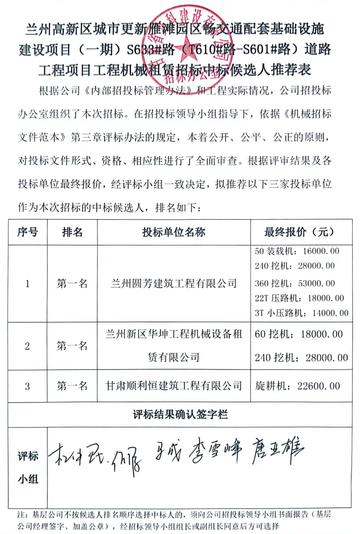 蘭州高新區城市更新雁灘園區暢交通配套基礎設施建設項目(一期)S633#路(T610#路-S601#路)道路工程項目工程機械租賃中標候選人及中標通知書