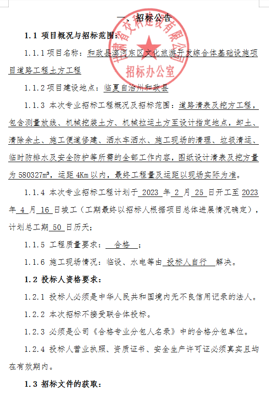 和政縣濱河東區文化旅游開發綜合體基礎設施項目道路工程土方工程招標