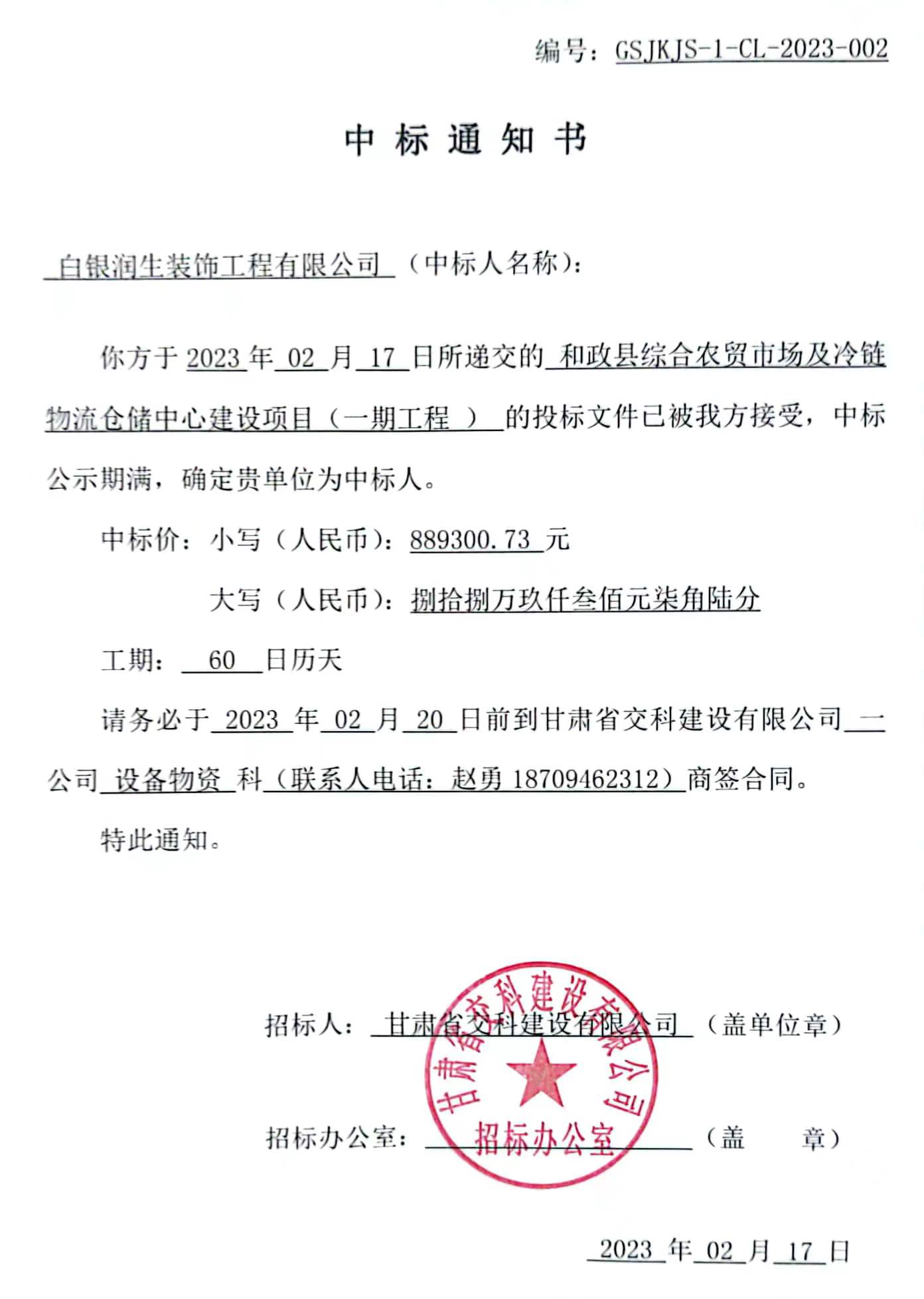 和政縣綜合農(nóng)貿(mào)市場(chǎng)及冷鏈物流倉(cāng)儲(chǔ)中心建設(shè)項(xiàng)目(一期工程 )材料招標(biāo)中標(biāo)候選人及中標(biāo)通知書