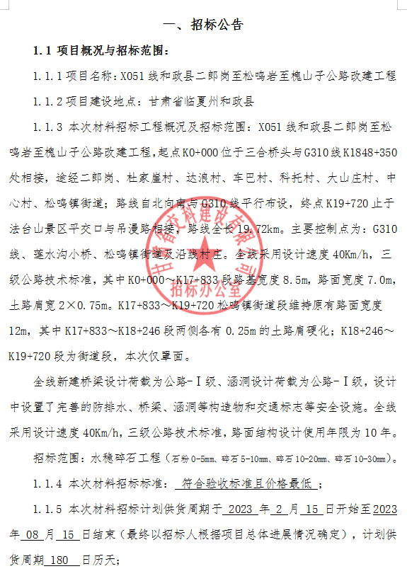 X051線和政縣二郎崗至松鳴巖至槐山子公路改建工程水穩(wěn)碎石材料招標