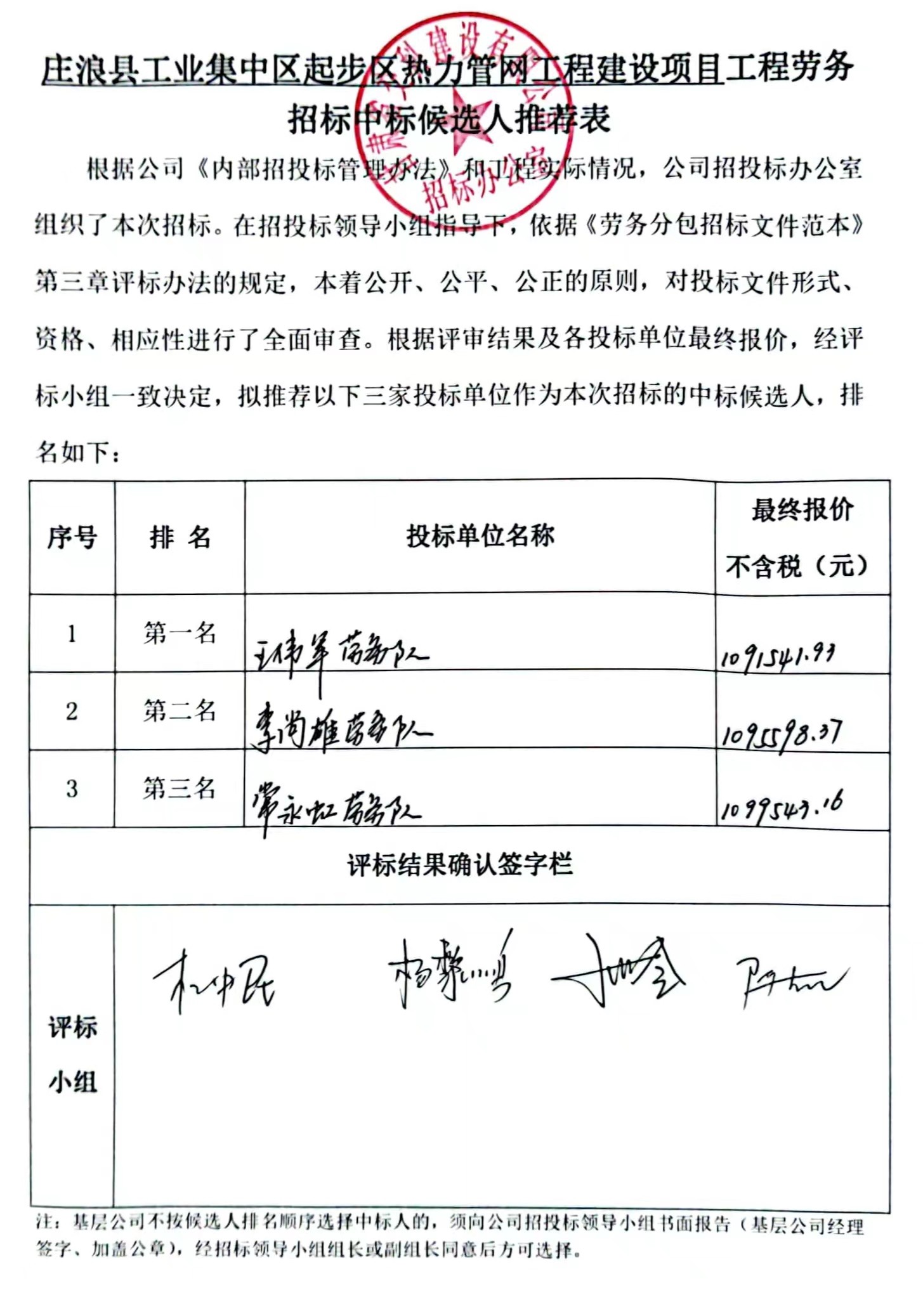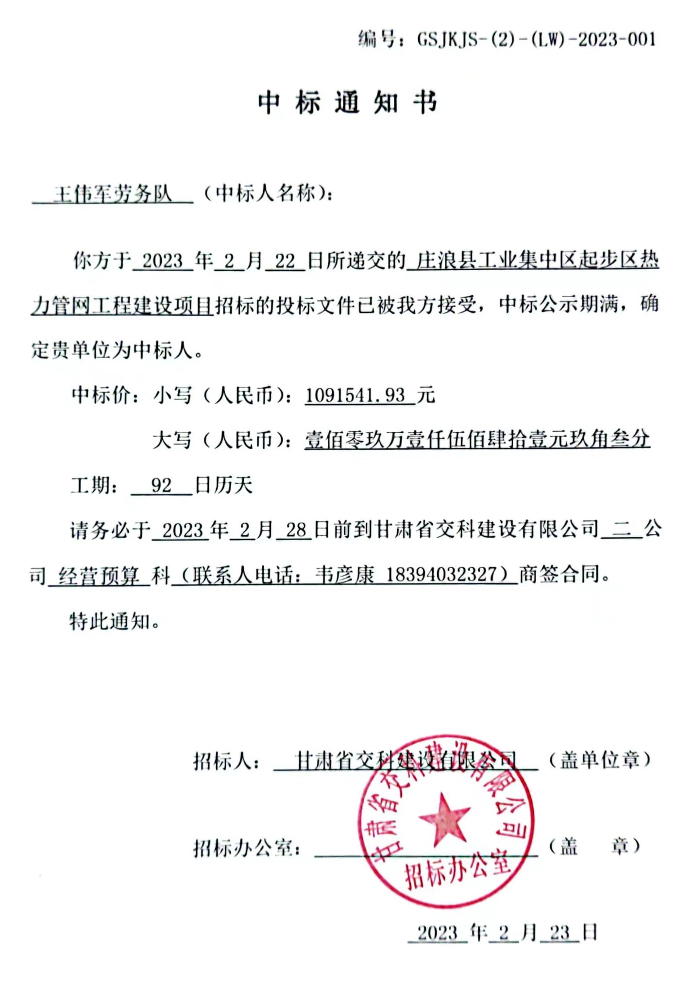 莊浪縣工業集中區起步區熱力管網工程建設項目中標候選人及中標通知書