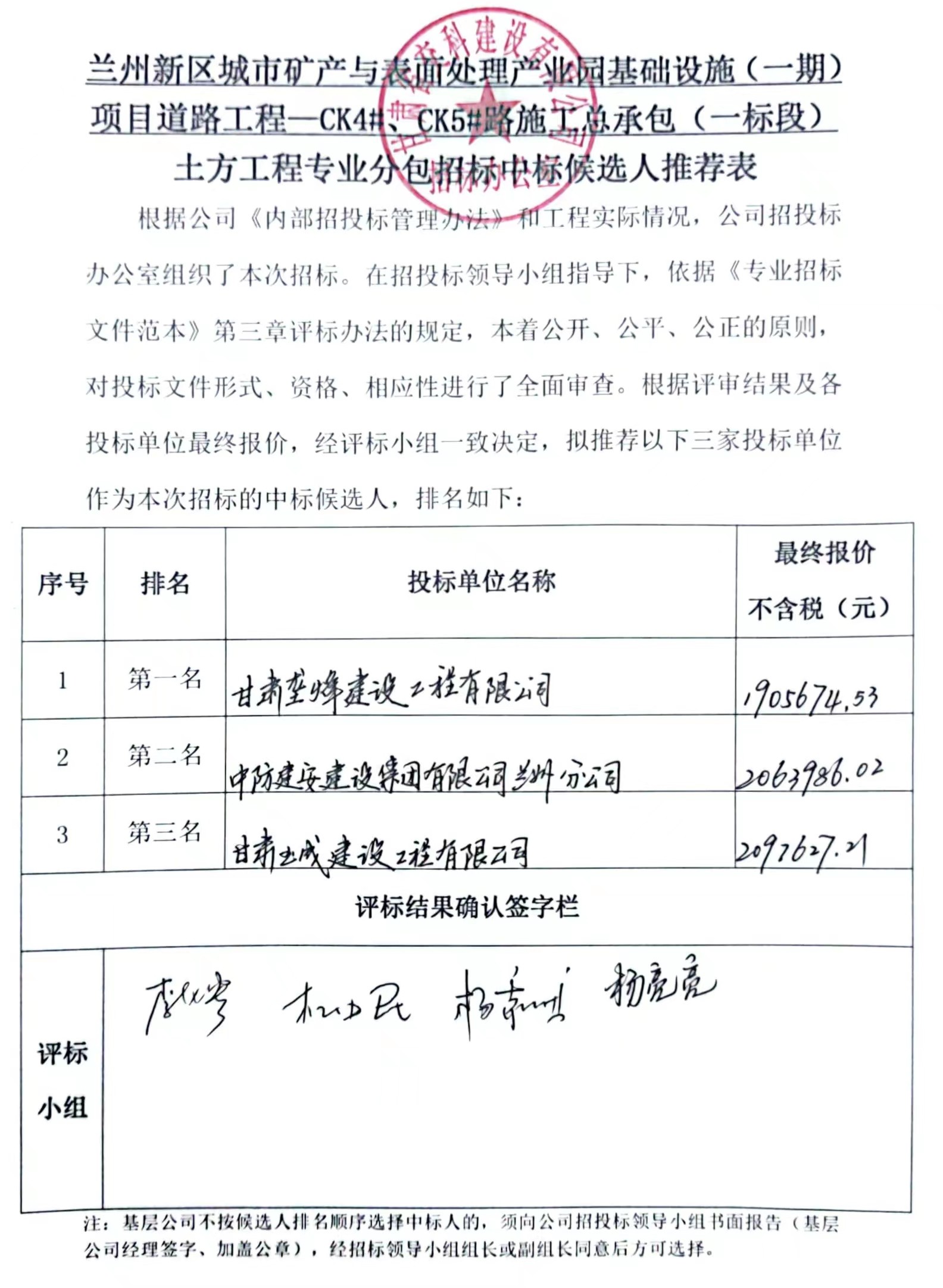 蘭州新區城市礦產與表面處理產業園基礎設施(一期)項目道路工程—CK4#、CK5#路施工總承包(一標段)中標候選人及中標通知書