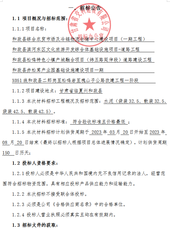 和政縣綜合農貿市場及冷鏈物流倉儲中心建設項目(一期工程);和政縣濱河東區文化旅游開發綜合體基礎設施項目-道路工程 ;和政縣松鳴特色小鎮產城融合項目(緯五路延伸段)道路建設工程;和政縣赤松茸產業園基礎設施建設項目一期;X051線和政縣二郎崗至松鳴巖至槐山子公路改建工程一材料招標公告