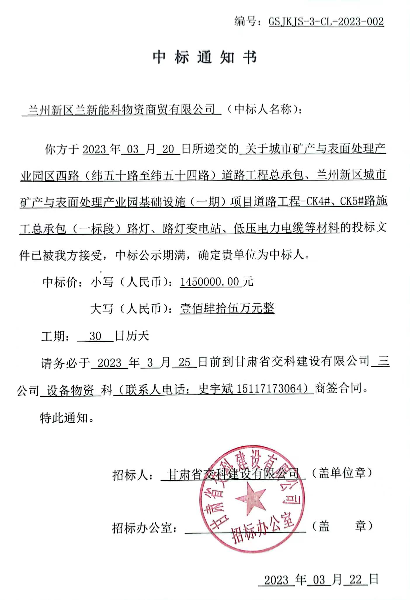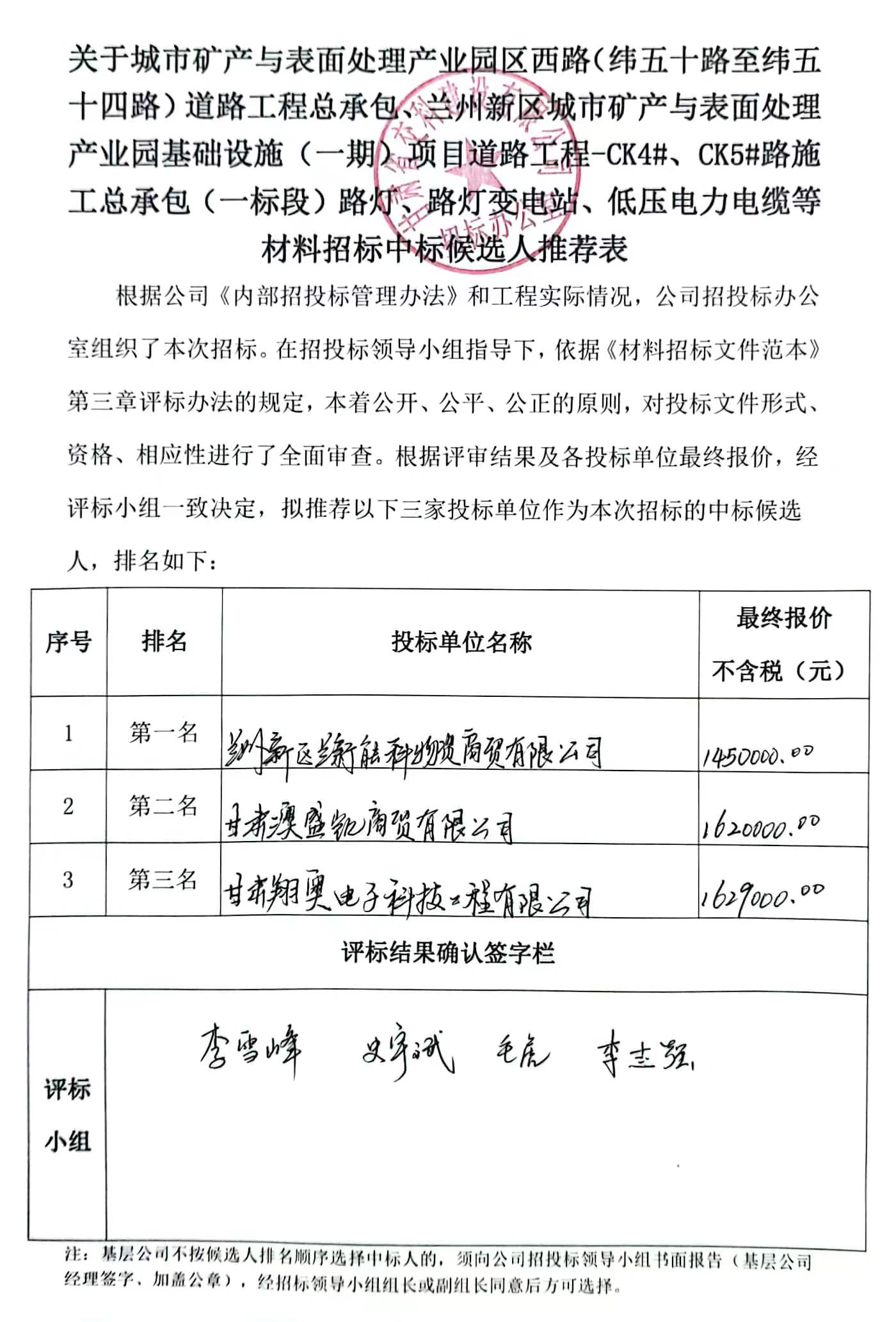 關(guān)于城市礦產(chǎn)與表面處理產(chǎn)業(yè)園區(qū)西路(緯五十路至緯五十四路)道路工程總承包、蘭州新區(qū)城市礦產(chǎn)與表面處理產(chǎn)業(yè)園基礎(chǔ)設(shè)施(一期)項目道路工程-ck4#、ck5#路施工總承包(一標段)路燈等材料招標中標候選人及中標通知書