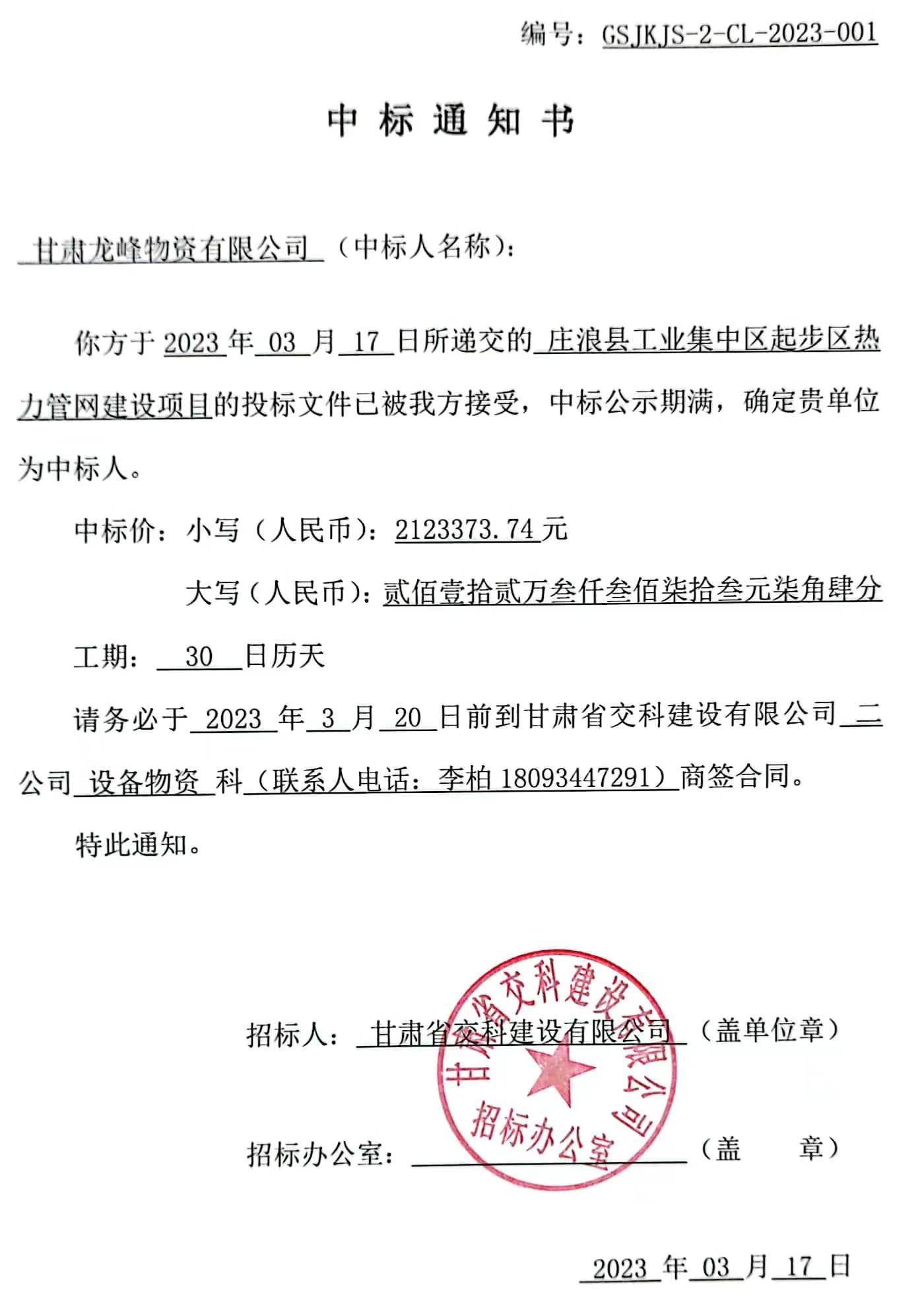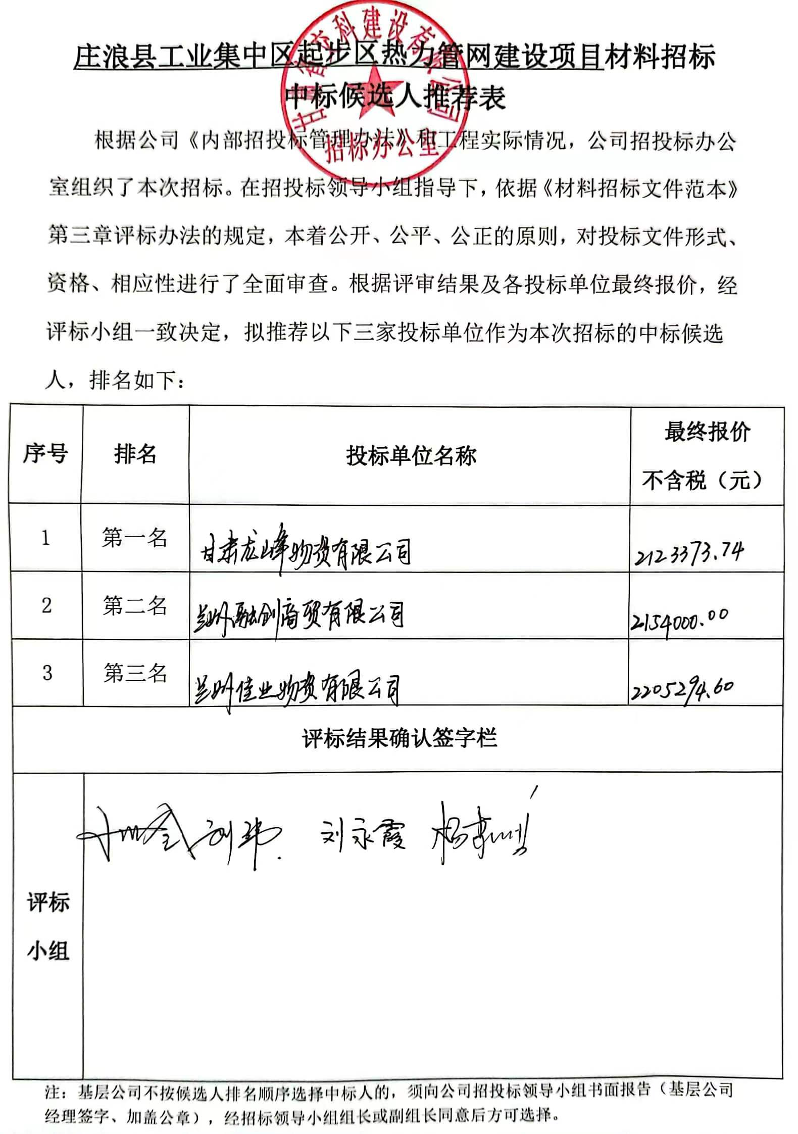 莊浪縣工業集中區起步區熱力管網建設項目招標候選人及中標通知書