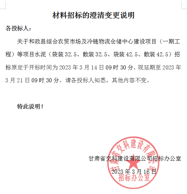 關于和政縣綜合農貿市場及冷鏈物流倉儲中心建設項目(一期工程)等項目水泥招標的澄清變更說明