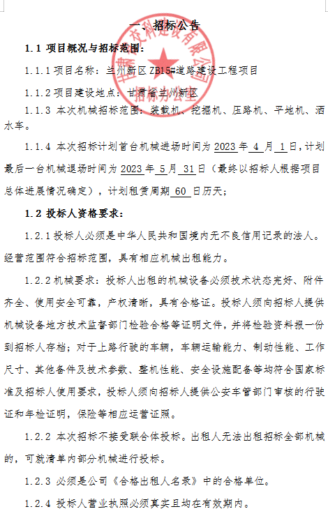 蘭州新區ZB15#道路建設工程項目機械租賃招標公告