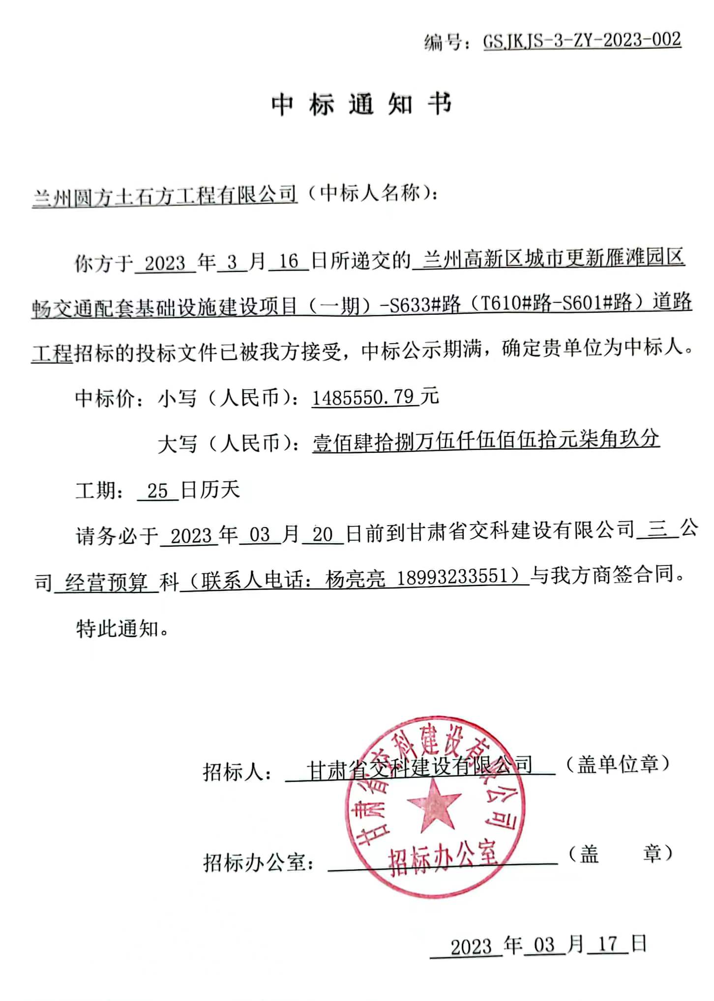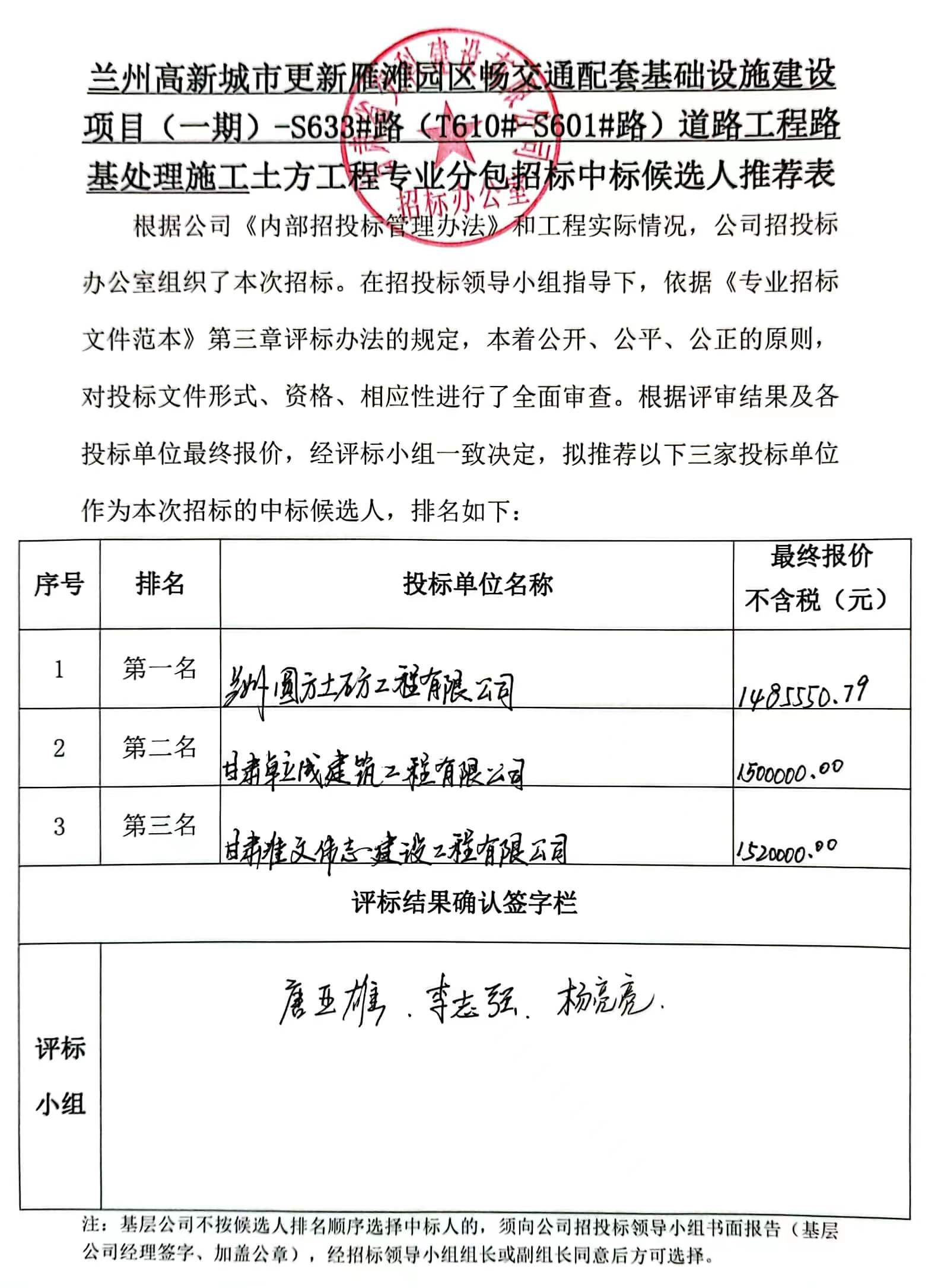 蘭州高新城市更新雁灘園區暢交通配套基礎設施建設項目(一期)-S633#路(T610#-S601#路)道路工程路基處理施工中標候選人及中標通知書