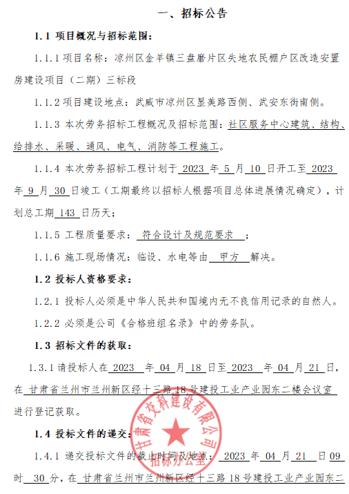 涼州區金羊鎮三盤磨片區失地農民棚戶區改造安置房建設項目(二期)三標段 社區服務中心勞務招標公告