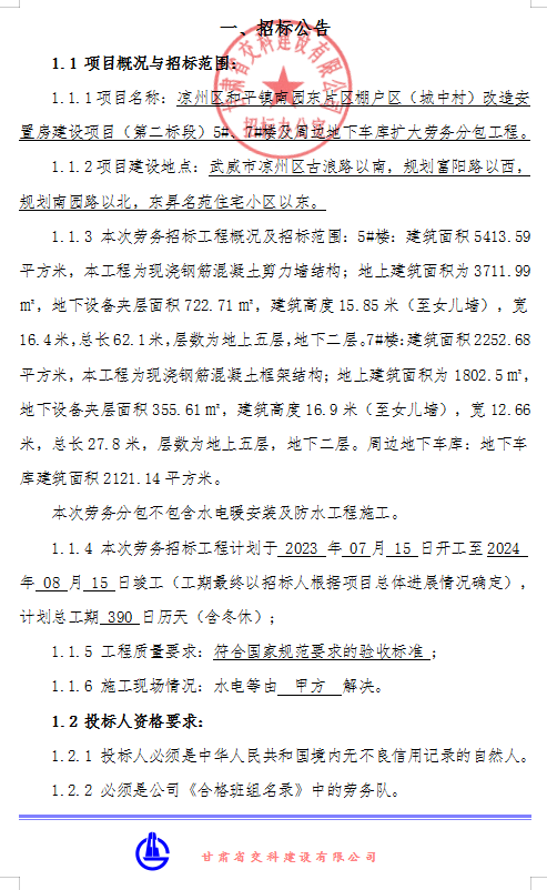 涼州區和平鎮南園東片區棚戶區(城中村) 改造安置房建設項目(第二標段) 5#、7#樓及周邊地下車庫-勞務招標公告