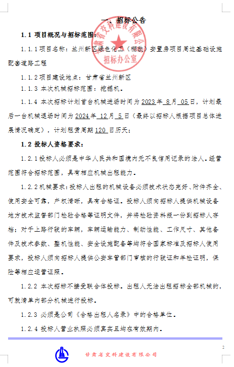 蘭州新區綠色化工(棚改)安置房項目周邊基礎設施配套道路工程機械租賃招標公告