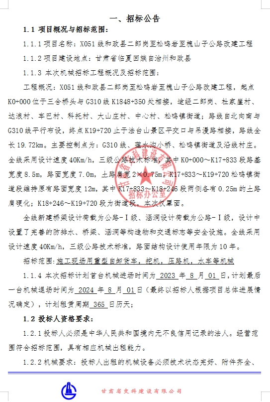 X051線和政縣二郎崗至松鳴巖至槐山子公路改建工程機(jī)械租賃招標(biāo)公告