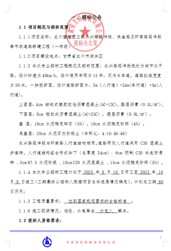 蘭州碧桂園三期永興路延伸段、朱雀路及環南路延伸段等市政道路新建工程(一標段)-專業分包招標公告