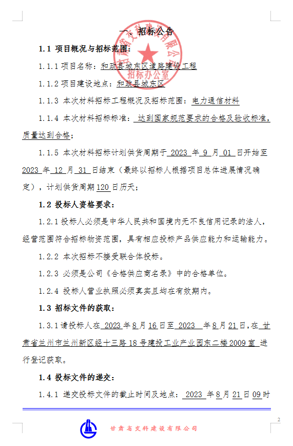 和政縣城東區道路建設工程-電力通信材料-招標公告