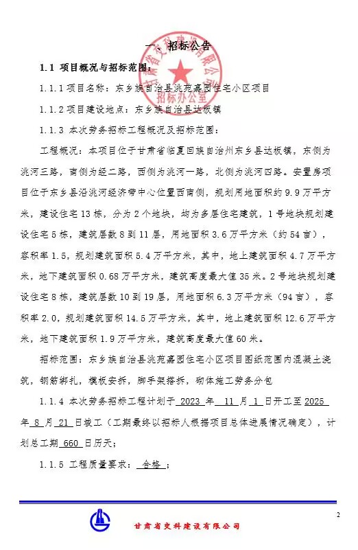 東鄉族自治縣洮苑嘉園住宅小區項目勞務招標公告