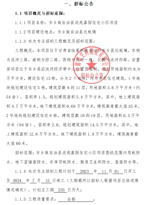 東鄉(xiāng)族自治縣洮苑嘉園住宅小區(qū)項目專業(yè)分包招標(biāo)公告