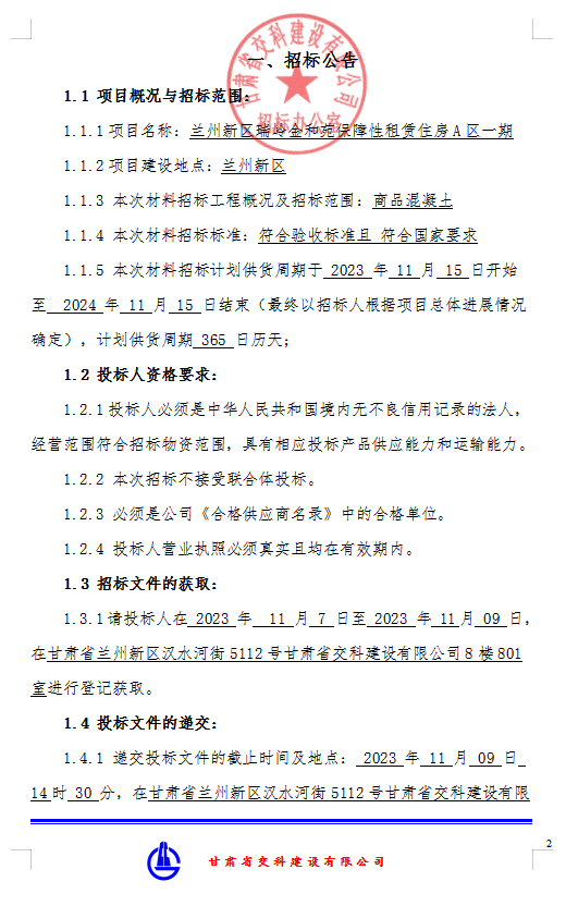 蘭州新區瑞嶺金和苑保障性租賃住房A區一期-混凝土招標公告