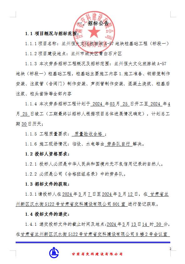 蘭州恒大文化旅游城A-57地塊樁基礎(chǔ)工程(標(biāo)段一)勞務(wù)分包招標(biāo)公告