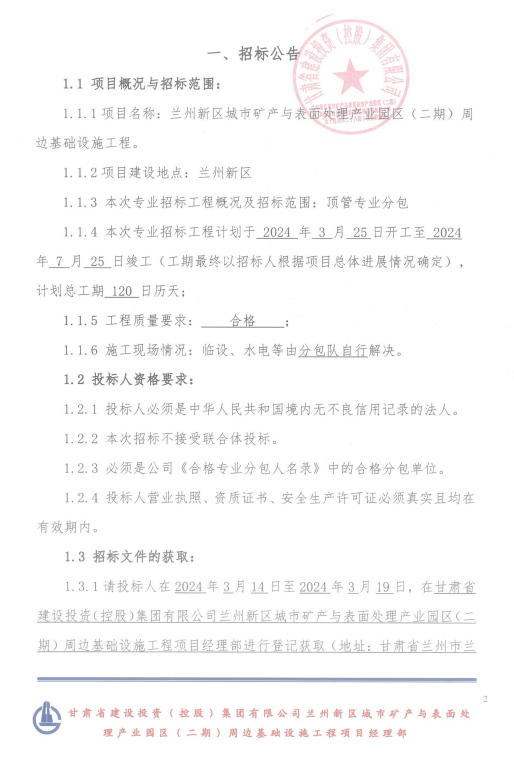 蘭州新區(qū)城市礦產(chǎn)與表面處理產(chǎn)業(yè)園區(qū)(二期)周邊基礎(chǔ)設(shè)施工程頂管工程施工-專業(yè)分包招標(biāo)公告
