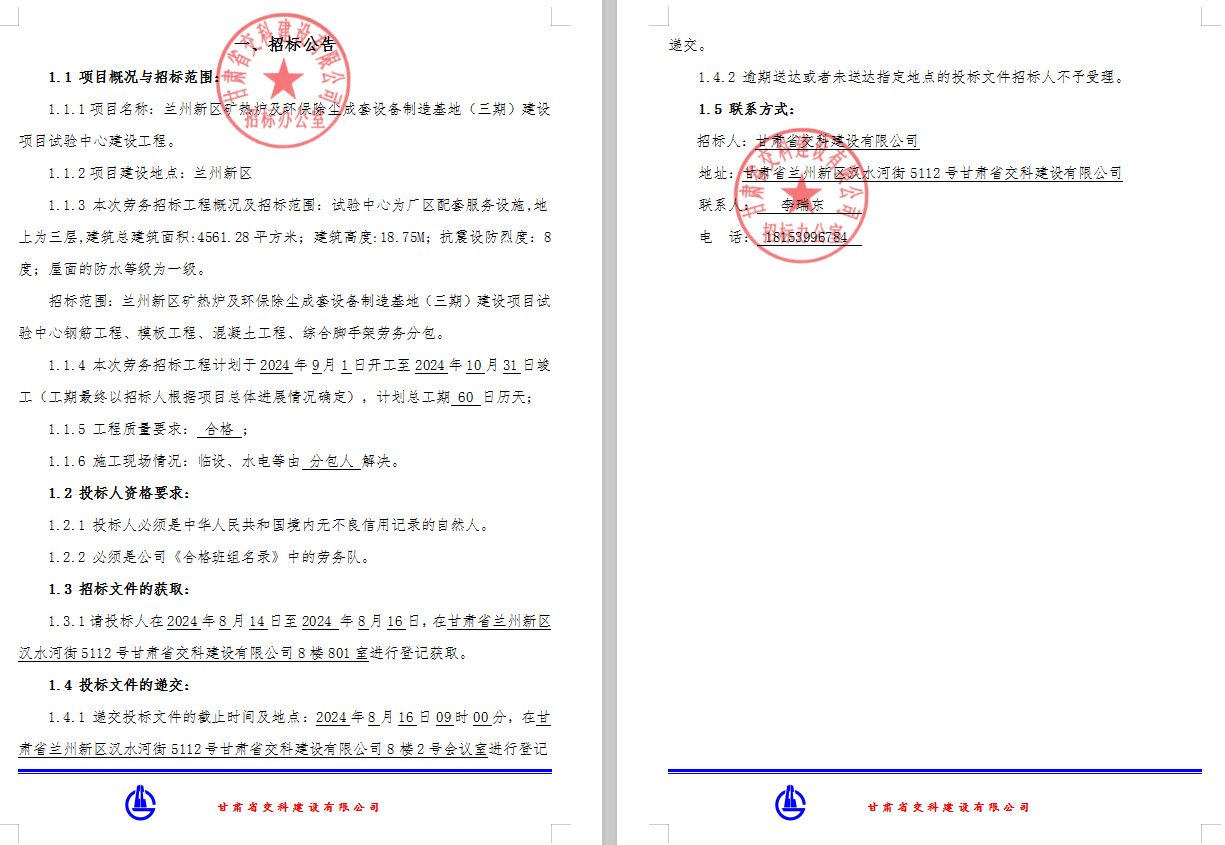 蘭州新區礦熱爐及環保除塵成套設備制造基地(三期)建設項目試驗中心建設工程-鋼筋、模板、混凝土、綜合腳手架-招標公告