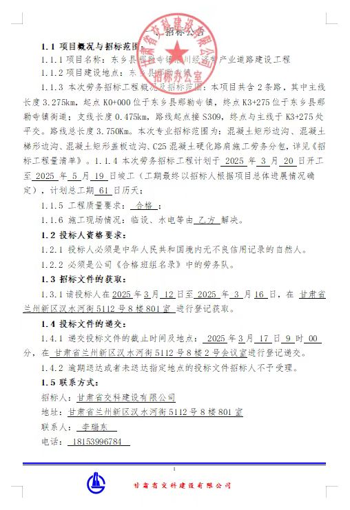 東鄉縣那勒寺鎮沿川經濟帶產業道路建設工程勞務分包招標公告