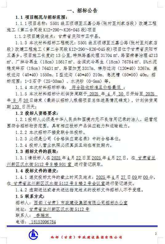 S501線五頃塬至三嘉公路(張村至劉家店段)改造工程施工(第二合同段K12+290-K26+045段)項目石子及水洗砂招標公告