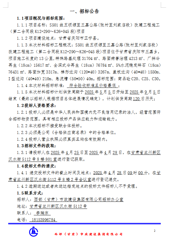 S501線五頃塬至三嘉公路(張村至劉家店段)改造工程施工(第二合同段K12+290-K26+045段)項目商品砼招標公告