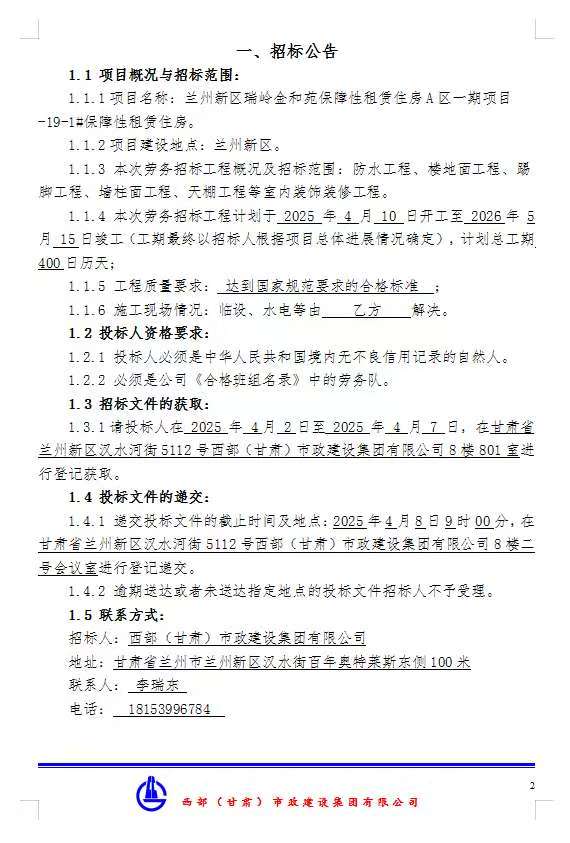 蘭州新區瑞嶺金和苑保障性租賃住房A區一期項目-19#-1#保障租賃住房-防水工程、樓地面工程等勞務分包招標公告