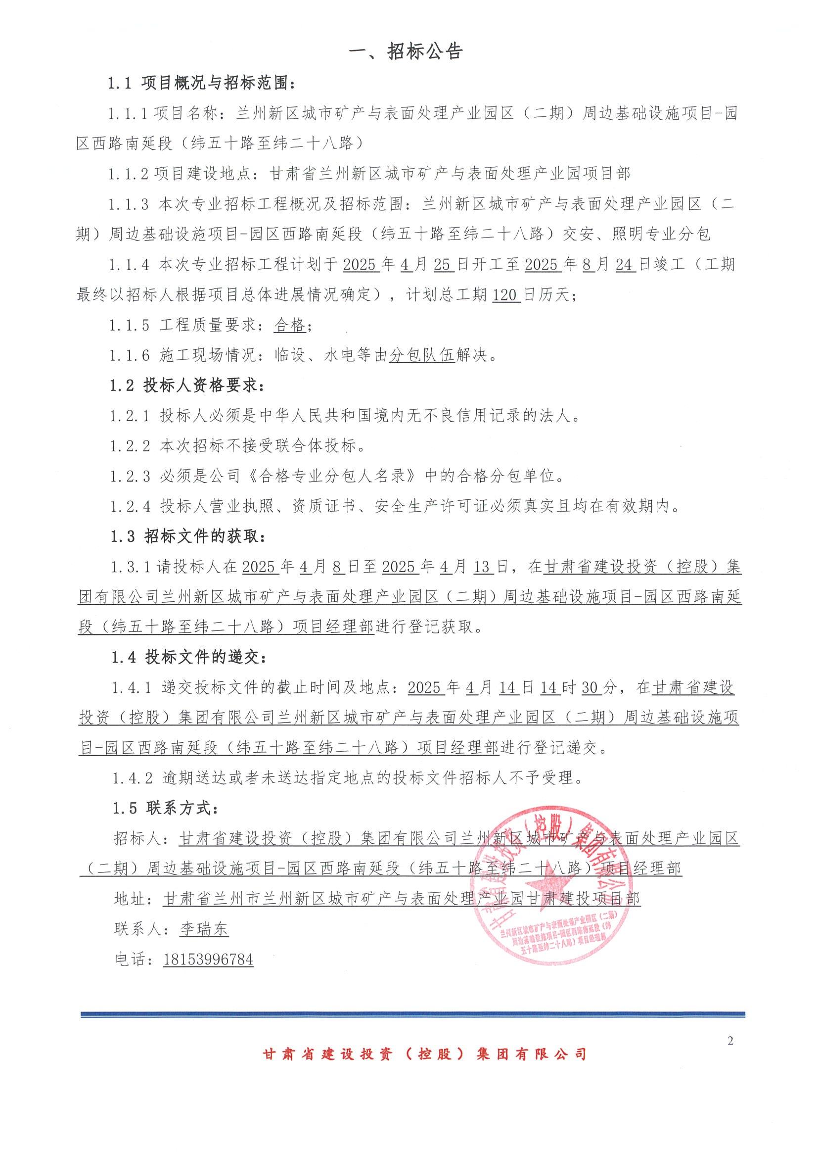 蘭州新區城市礦產與表面處理產業園區(二期)周邊基礎設施項目-園區西路南延段(緯五十路至緯二十八路)交安及照明專業分包招標公告