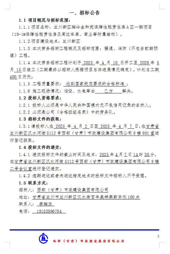 蘭州新區瑞嶺金和苑保障性租賃住房A區一期項目-19#-1#保障租賃住房及周邊車庫、商業等附屬結構-暖通、消防勞務分包招標公告