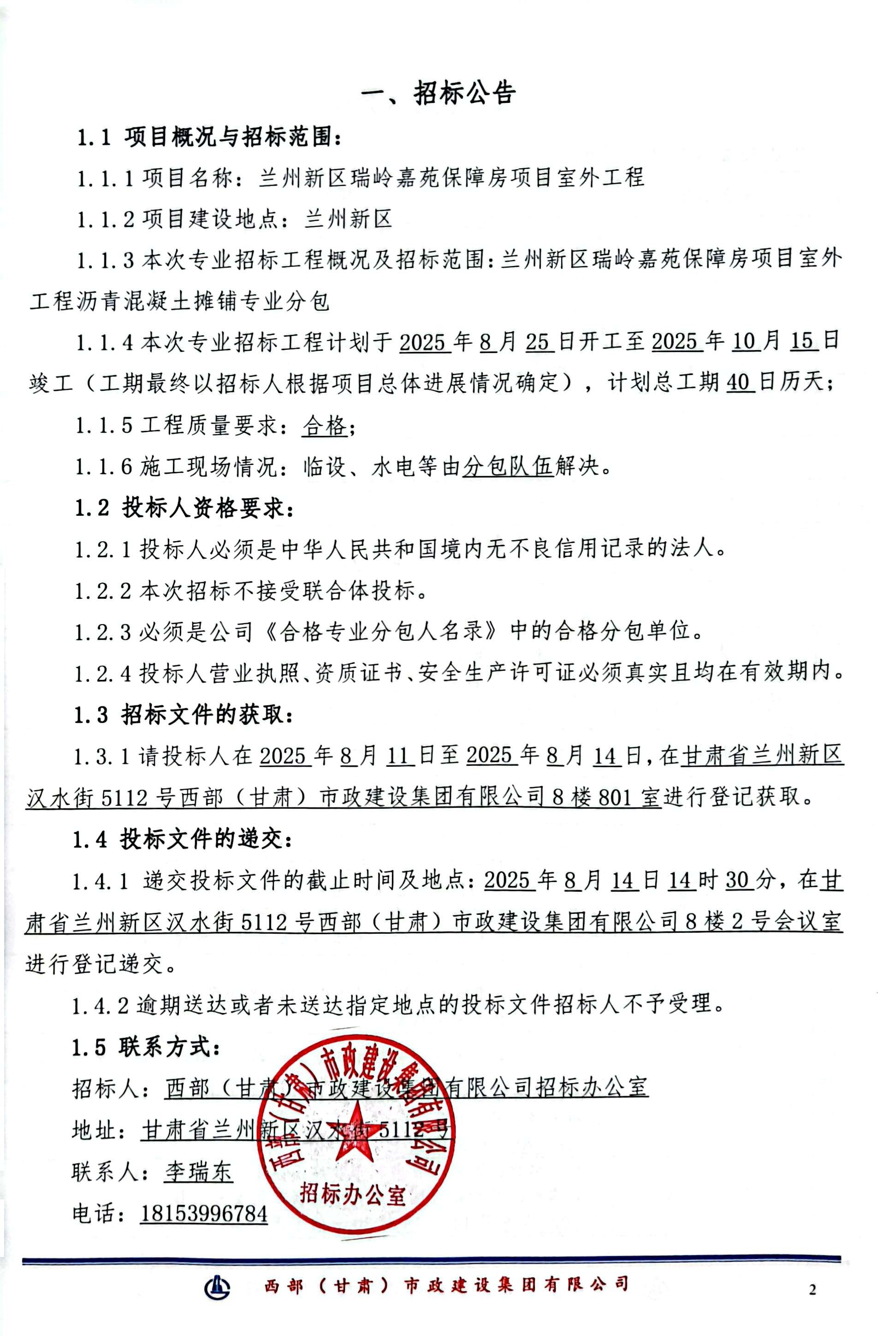 蘭州新區瑞嶺嘉苑保障房項目室外工程瀝青混凝土攤鋪專業分包-招標公告