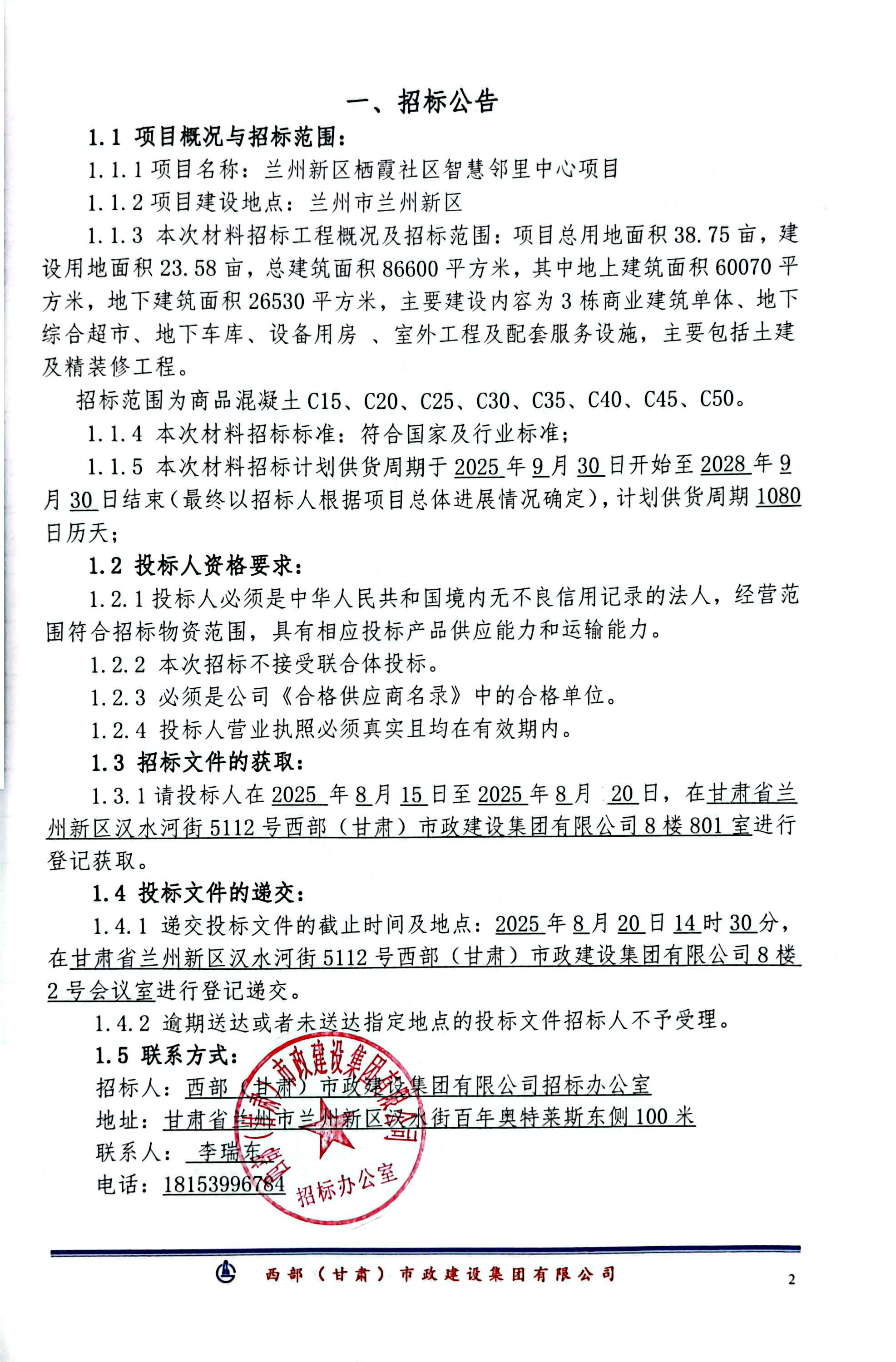 蘭州新區棲霞社區智慧鄰里中心項目-商品混凝土-招標公告