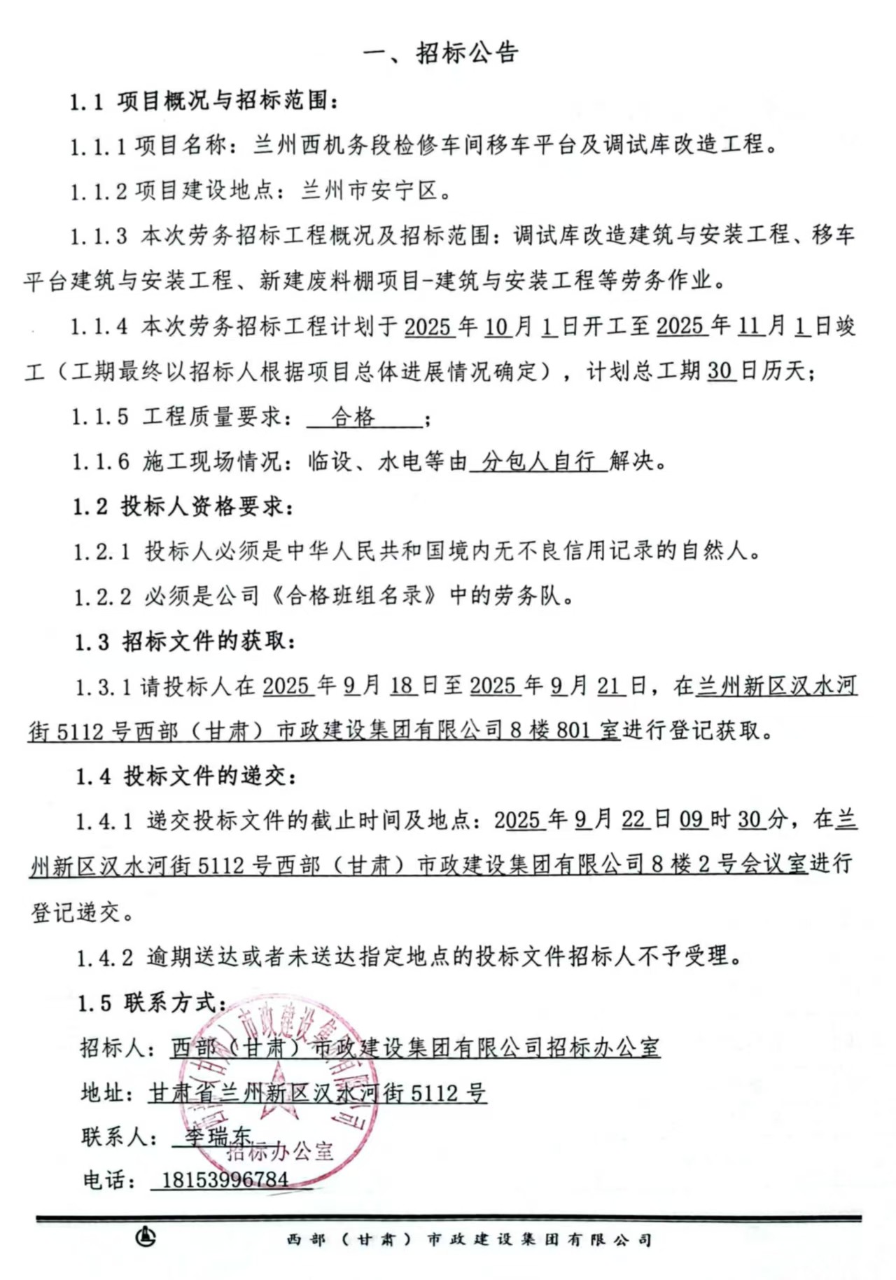 蘭州西機務(wù)段檢修車間移車平臺及調(diào)試庫改造工程-勞務(wù)分包招標(biāo)公告