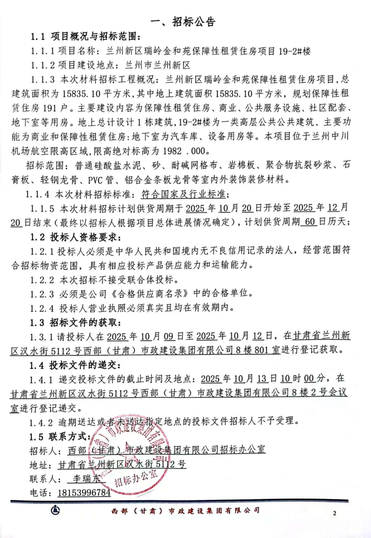 蘭州新區瑞嶺金和苑保障性租賃住房項目19-2#樓-室內外裝飾裝修材料-招標公告