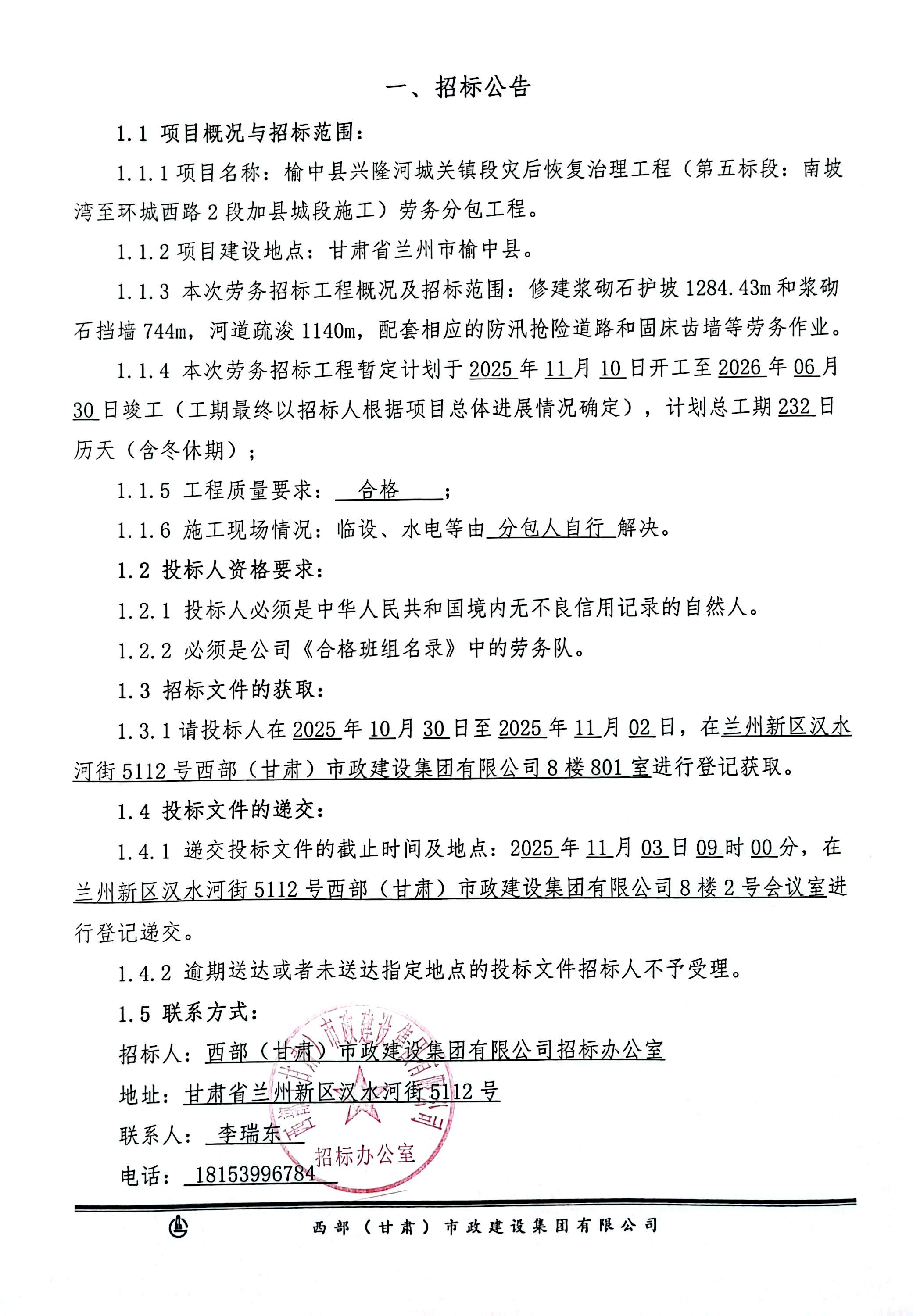 榆中縣興隆河城關(guān)鎮(zhèn)段災(zāi)后恢復(fù)治理工程(第五標段:南坡灣至環(huán)城西路2段加縣城段施工)勞務(wù)分包工程-招標公告
